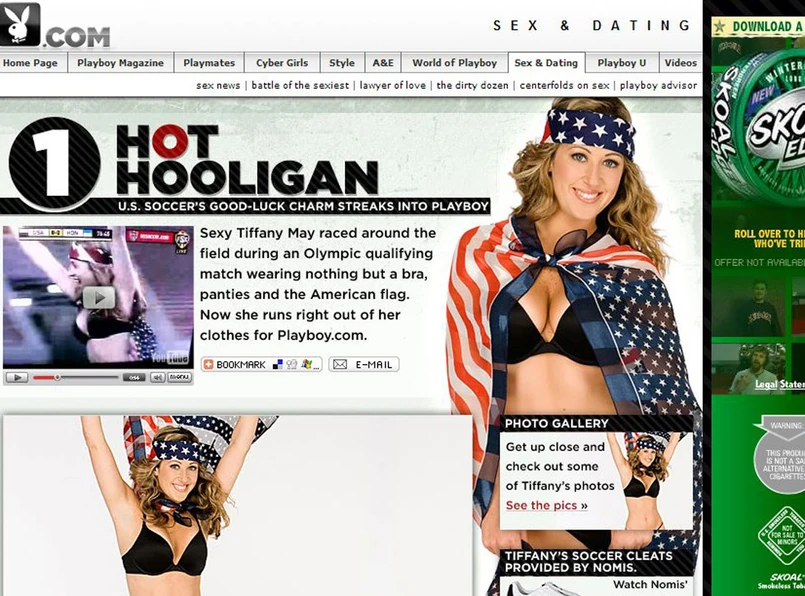 Wreszcie ją ktoś docenił. Tiffany May lubi zrzucać ciuszki na oczach wielu gapiów. Ostatnio zrobiła to podczas meczu USA - Honduras. Jak się okazało, nie na darmo wtedy biegała po boisku. Po tym "popisie" rozbieraną sesję zaproponował jej "Playboy".