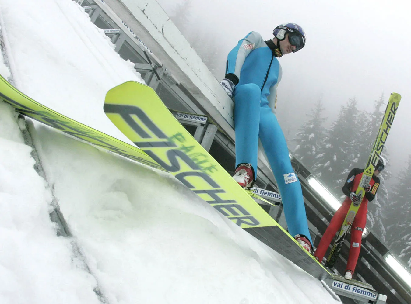 Sobotnie zawody zakończyły się po pierwszej serii. Przez cały dzień w Predazzo było ciepło, ale bardzo deszczowo. Przed konkursem piłami łańcuchowymi nacinano rozbieg, aby przyśpieszyć odpływ rozpuszczającej lód wody. Mimo tego po pierwszym skoku serii finałowej rywalizację przerwano. Bjoern Einar Romoeren miał makabrycznie wyglądający upadek. Na rozbiegu odpięło mu się jedno z wiązań i Norweg wyszedł w powietrze z jedną nartą. Na szczęście umiejętnie zachował się w groźnej sytuacji i dość szczęśliwie tylko uderzył plecami o bulę. Kilka minut po upadku wstał i o własnych siłach opuścił skocznię, a następnego dnia wystartował w kwalifikacjach.