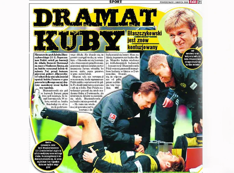 "Na razie nie wiadomo, jak poważna jest ta kontuzja i ile będę musiał się leczyć. Mam nadzieję, że przerwa nie będzie długa. Wszystko będzie wiadomo po dokładniejszych badaniach" - mówi Błaszczykowski.