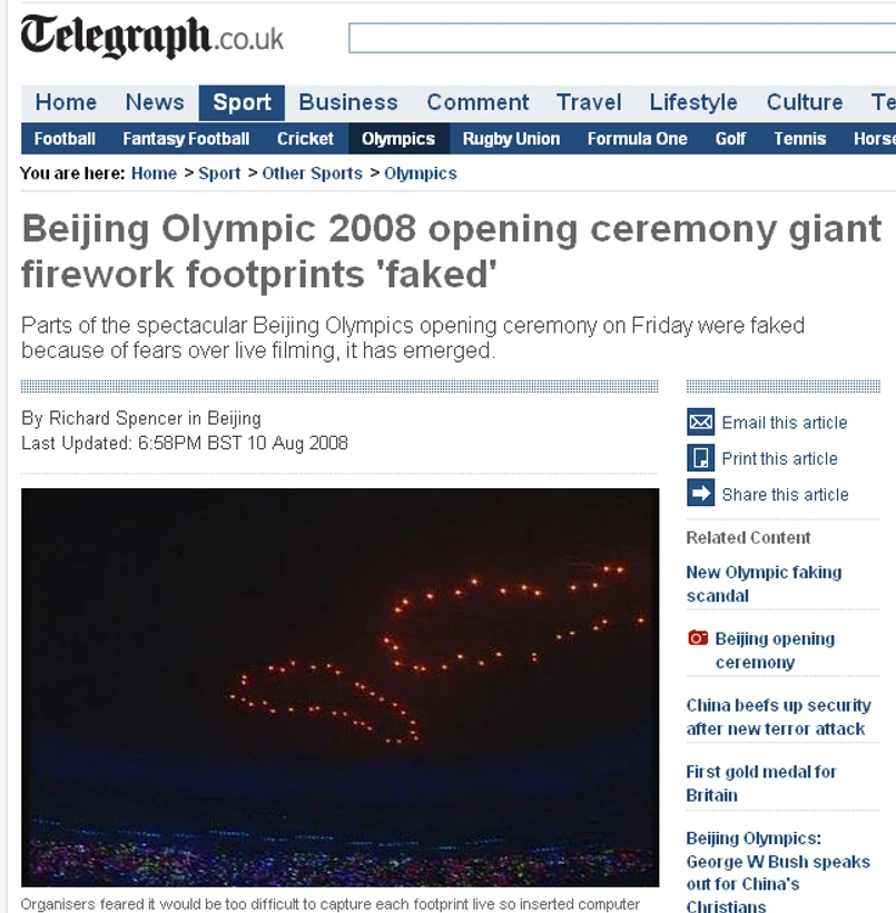 To jednak nie jedyne oszustwo, jakiego dopuścili się Chińczycy na ceremonii otwarcia igrzysk. Organizatorzy przyznali, że część pokazu sztucznych ogni, jaki oglądaliśmy w telewizji, była... wygenerowana komputerowo i nagrana wcześniej.