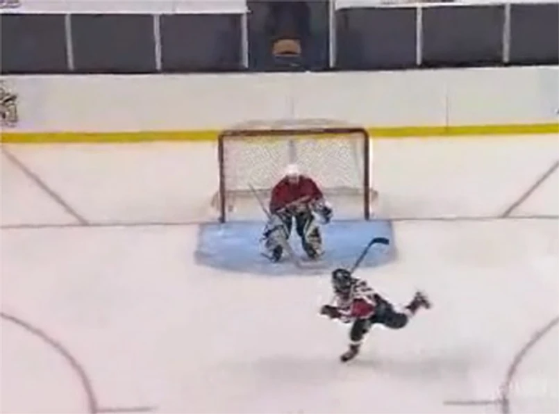 Czy oglądamy przyszłą hokejową gwiazdę? Kto wie. Jeśli ten młody hokeista będzie grał tak jak strzela, to pobije wszystkie rekordy legendarnego Wayne'a Gretzky'ego. 9-latek podjeżdża, zagarnia krązek kijem i sunie na bramkę. Potem strzela fantastyczną bramkę, której nie powstydziłby się żaden hokeista świata.
