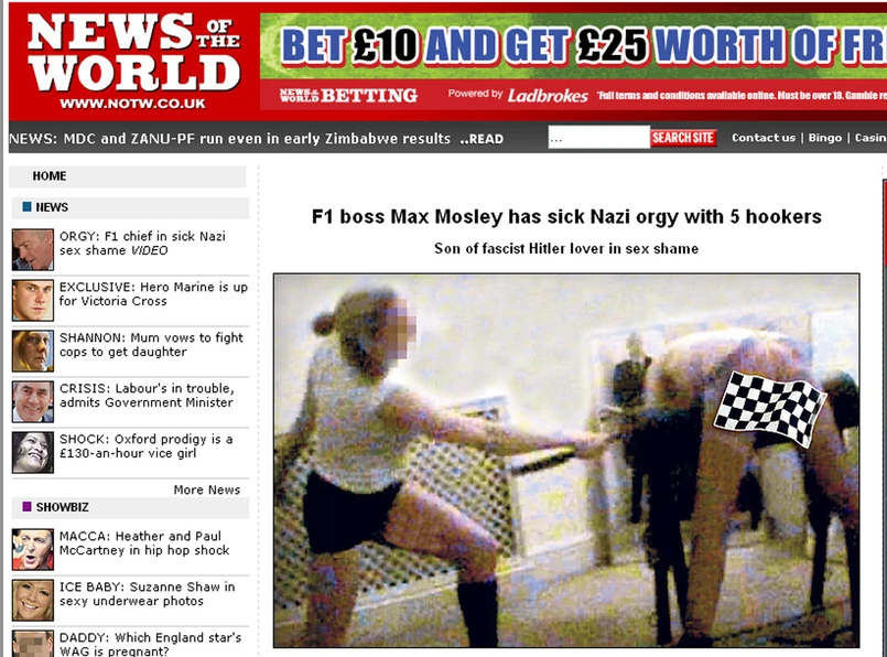 Max Mosley pojawił się w gazecie i stronie internetowej na zdjęciach i filmiku. Wyraźnie widać na nich, że prezydent "zabawia się" z pięcioma prostytutkami. Jest przy tym specyficznie ubrany - w nazistowski mundur. Dodajmy od razu, że Mosley jest żonaty.