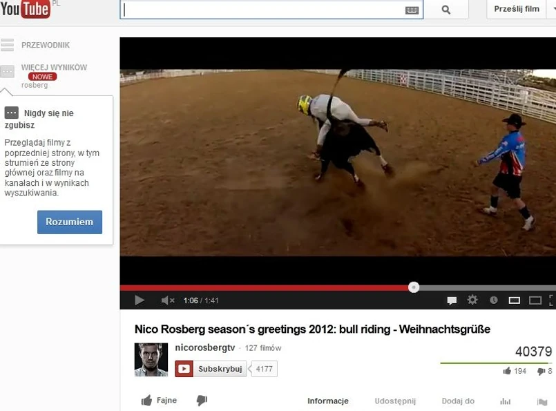 27-letni Rosberg w końcówce roku postanowił sprawdzić się w nowej roli. Strój założył ten sam, gdy wsiada do bolidu teamu Mercedes GP (identyczny był nawet kask), ale wyzwanie zupełnie inne - jak najdłużej utrzymać się w siodle na ogromnym byku.