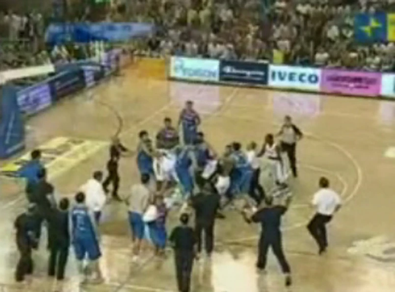 To był sparing jak każdy inny. Przynajmniej na początku. Włosi mierzyli się z Kanadą, aż w pewnym momencie Włoch Stefano Mancinelli uderzył łokciem w tył głowy rywala, Aarona Doornekampa. Wtedy zaczęła się prawdziwa zadyma, z udziałem prawie wszystkich członków obu ekip. Zobaczcie sami!