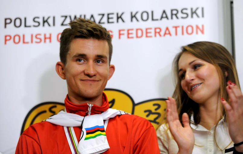 7 Kolarski mistrz świata Michał Kwiatkowski (P) i Agnieszka Skalniak (L) prezentują medale podczas powitania na warszawskim lotnisku Okęcie, 29 bm. Kwiatkowski wrócił z Hiszpanii, gdzie zdobył tytuł mistrza świata elity w kolarskim wyścigu ze startu wspólneg, a Agnieszka Skalniak zdobyła brązowy medal w wyścigu ze startu wspólnego juniorek