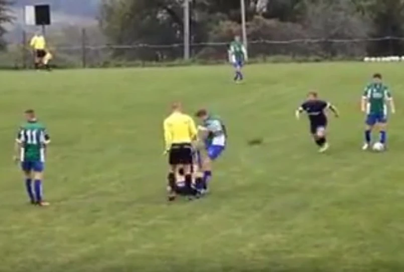 W trakcie gry w ferworze walki dwóch zawodników zderzyło się głowami i upadło na murawę. Po chwili jeden z nich podniósł się i skopał leżącego rywala.