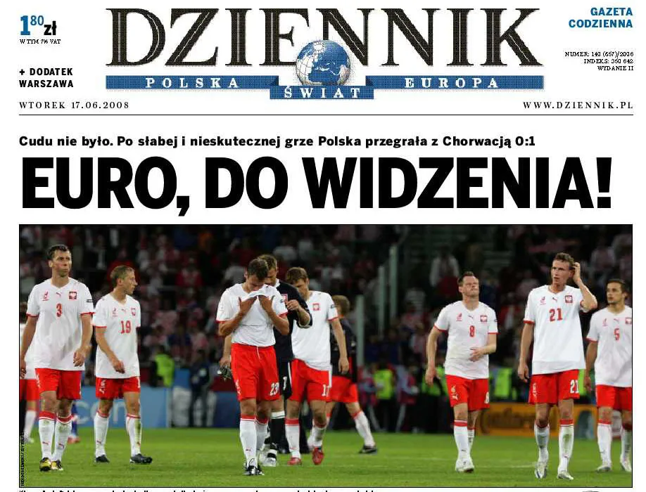 Mieliśmy być najlepszą drużyną Euro. Byliśmy najgorszą. Wczoraj ograli nas nawet rezerwowi piłkarze Chorwacji. Normalnie po takiej klęsce każdy trener podaje się do dymisji. Niestety, nie Leo Beenhakker. Leo wciąż uważa, że uczynił u nas cud. A fakty są bezlitosne: mamy 27. miejsce na świecie, 16. w Europie, a najlepszy polski piłkarz to Brazylijczyk... Jeśli na Euro 2012, które odbędzie się w Polsce i na Ukrainie, chcemy oglądać zwycięstwa naszych, a nie kompromitację, w piłce musi się zmienić wszystko. Przede wszystkim odejść musi prezes PZPN Michał Listkiewicz, który utrzymuje piłkarski skansen. Miliony złotych zamiast na pensje dla bossów i pseudozawodowych piłkarzy muszą iść na szkolenie dzieci. Nie wystarczą też same boiska, które buduje rząd. Trzeba opracować system wyszukiwania i szkolenia młodych talentów. Zamiast transferów marnych obcokrajowców, więcej miejsc w klubach muszą zająć Polacy. Tylko w ten sposób możemy odbić się od dna.