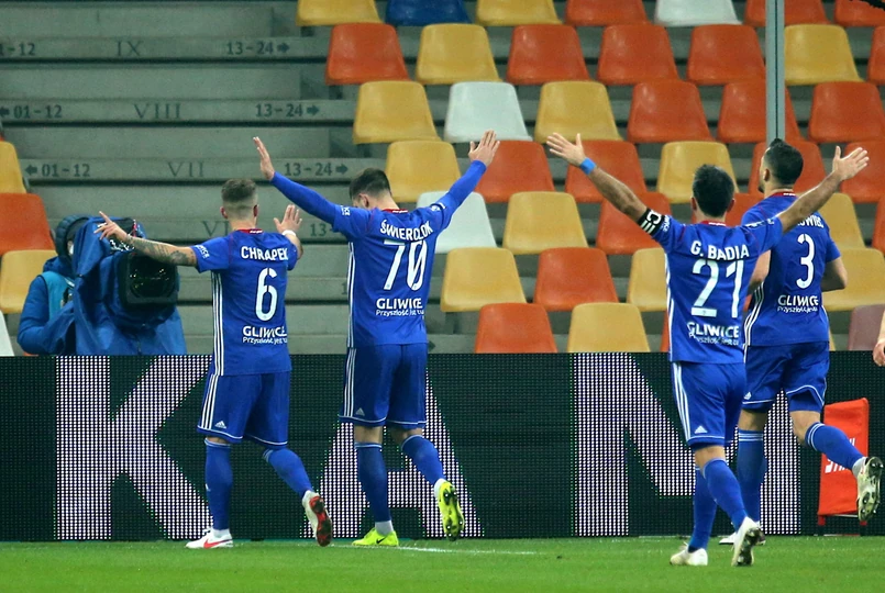 Piast objął prowadzenie w 38. minucie. Michał Chrapek tak strzelał na bramkę rywala, że piłka trafiła na głowę Jakuba Świerczoka. Gliwicki napastnik bez problemów pokonał Michala Peskovica.