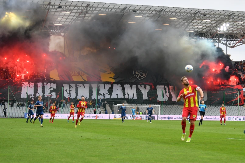 Cztery minuty później zespół z Łodzi miał jeszcze lepszą sytuację, ale strzał Partyka Stępińskiego w kapitalnym stylu obronił Marceli Zapytowski. Gospodarze prowadzeni przez tymczasowego szkoleniowca Kamila Kuzerę mieli kłopoty z przedostaniem się pod pole karne rywali, a jak już się tam znaleźli, łódzka obrona spisywała się bez zarzutu. Po półgodzinie gry kieleccy fani odpalili race i spotkanie na kilka minut zostało przerwane.