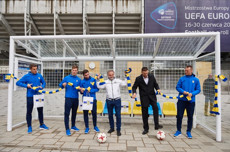 5 Piłkarz Arki Gdynia Luka Zarandia (C) wręcza klubowe upominki pasażerce pierwszego autobusu komunikacji miejskiej w Gdyni, który zatrzymał się na oficjalnie otwartym przystanku przystanku autobusowym w kształcie bramki piłkarskiej