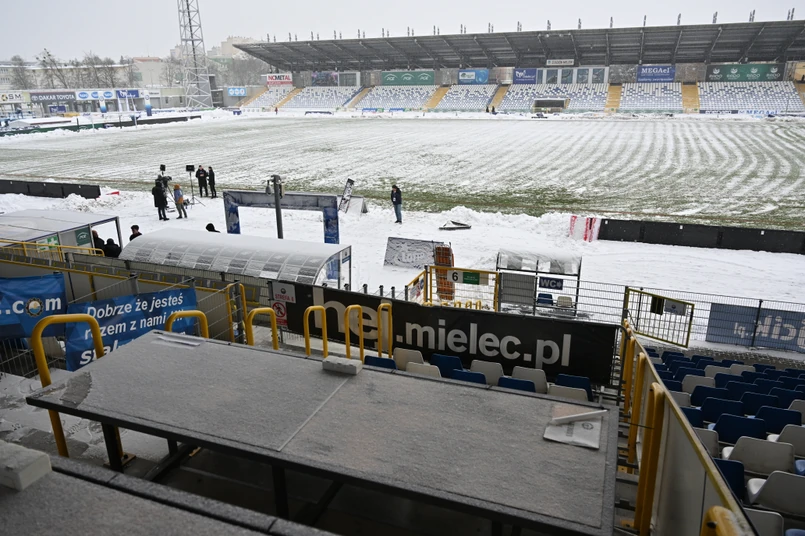 1/6 Stadion Miejski w Mielcu. Dzisiejszy mecz piłkarskiej ekstraklasy PGE FKS Stal Mielec - ŁKS Łódź, został przełożony na inny termin z powodu trudnych warunków atmosferycznych