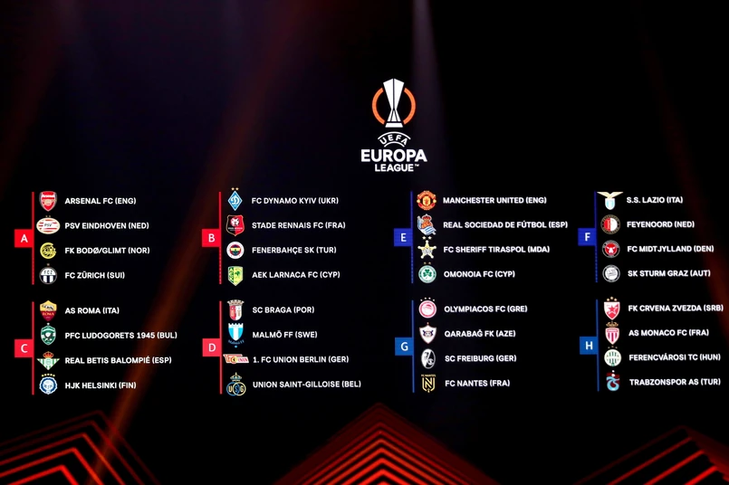 Grupa A: Arsenal Londyn, PSV Eindhoven, Bodoe/Glimt, FC Zuerich Grupa B: Dynamo Kijów, Rennes, Fenerbahce Stambuł, AEK Larnaka Grupa C: AS Roma, Łudogorec Razgrad, Betis Sewilla, HJK Helsinki Grupa D: SC Braga, Malmoe FF, Union Berlin, RU Saint-Gilloise Grupa E: Manchester United, Real Sociedad San Sebastian, Sheriff Tyraspol, Omonia Nikozja Grupa F: Lazio Rzym, Feyenoord Rotterdam, FC Midtjylland, Sturm Graz Grupa G: Olympiakos Pireus, Karabach Agdam, SC Freiburg, FC Nantes Grupa H: Crvena Zvezda Belgrad, AS Monaco, Ferencvaros Budapeszt, Trabzonspor