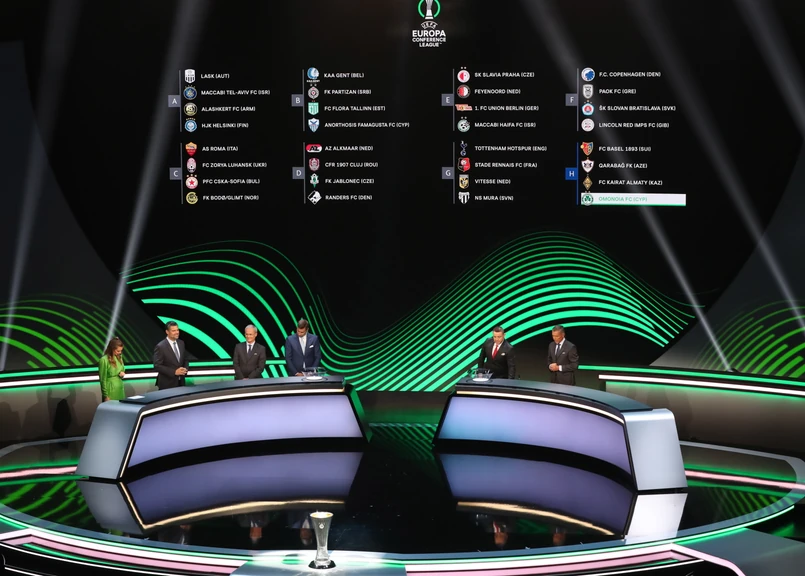 Grupy piłkarskiej Ligi Konferencji w sezonie 2021/22: Grupa A: LASK Linz, Maccabi Tel Awiw, Alaszkert Erywań, HJK Helsinki Grupa B: KAA Gent, Partizan Belgrad, Flora Tallinn, Anorthosis Famagusta Grupa C: AS Roma, Zoria Ługańsk, CSKA Sofia, Bodoe/Glimt Grupa D: AZ Alkmaar, CFR Cluj, FK Jablonec, Randers FC Grupa E: Slavia Praga, Feyenoord Rotterdam, Union Berlin, Maccabi Hajfa Grupa F: FC Kopenhaga, PAOK Saloniki, Slovan Bratysława, Lincoln Red Imps Grupa G: Tottenham Hotspur, Rennes, Vitesse Arnhem, NS Mura Grupa H: FC Basel, Karabach Agdam, Kajrat Ałmaty, Omonia Nikozja