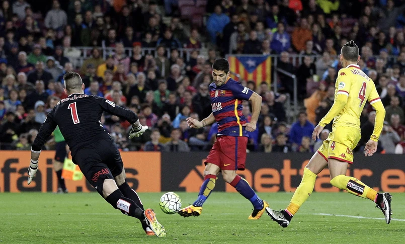 Real na chwilę został liderem, ale wieczorem został wyprzedzony przez Barcelonę i Atletico. Katalończycy rozgromili znajdujący się w strefie spadkowej Sporting Gijon 6:0, choć do przerwy prowadzili tylko 1:0 po golu Lionela Messiego. Druga połowa była jednak popisem Luisa Suareza. Urugwajczyk zdobył cztery bramki, w tym dwie z rzutów karnych. Jedną (również z "jedenastki") dołożył Brazylijczyk Neymar.W poprzednim spotkaniu, wygranym 8:0 z Deportivo La Coruna, Suarez również strzelił cztery gole. Łącznie ma już 34 trafienia w tym sezonie hiszpańskiej ekstraklasy, dzięki czemu wyprzedził prowadzącego dotychczas Ronaldo (31).