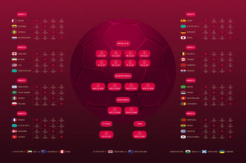 Terminarz piłkarskich mistrzostw świata w Katarze (godziny według czasu polskiego): niedziela, 20 listopada grupa A: Katar - Ekwador (godz. 17.00, Al-Chaur) poniedziałek, 21 listopada grupa B: Anglia - Iran (14.00, Ar-Rajjan) grupa A: Senegal - Holandia (17.00, Ad-Dauha) grupa B: USA - Walia (20.00, Ar-Rajjan) wtorek, 22 listopada grupa C: Argentyna - Arabia Saudyjska (11.00, Ad-Da'ajin) grupa D: Dania - Tunezja (14.00, Ad-Dauha) grupa C: Meksyk - Polska (17.00, Ad-Dauha) grupa D: Francja - Australia (20.00, Al-Wakra) środa, 23 listopada grupa F: Maroko - Chorwacja (11.00, Al-Chaur) grupa E: Niemcy - Japonia (14.00, Ar-Rajjan) grupa E: Hiszpania - Kostaryka (17.00, Ad-Dauha) grupa F: Belgia - Kanada (20.00, Ar-Rajjan) czwartek, 24 listopada grupa G: Szwajcaria - Kamerun (11.00, Al-Wakra) grupa H: Urugwaj - Korea Płd. (14.00, Ad-Dauha) grupa H: Portugalia - Ghana (17.00, Ad-Dauha) grupa G: Brazylia - Serbia (20.00, Ad-Da'ajin) piątek, 25 listopada grupa B: Walia - Iran (11.00, Ar-Rajjan) grupa A: Katar - Senegal (14.00, Ad-Dauha) grupa A: Holandia - Ekwador (17.00, Ar-Rajjan) grupa B: Anglia - USA (20.00, Al-Chaur) sobota, 26 listopada grupa D: Tunezja - Australia (11.00, Al-Wakra) grupa C: Polska - Arabia Suadyjska (14.00, Ad-Dauha) grupa D: Francja - Dania (17.00, Ad-Dauha) grupa C: Argentyna - Meksyk (20.00, Ad-Da'ajin) niedziela, 27 listopada grupa E: Japonia - Kostaryka (11.00, Ar-Rajjan) grupa F: Belgia - Maroko (14.00, Ad-Dauha) grupa F: Chorwacja - Kanada (17.00, Ar-Rajjan) grupa E: Hiszpania - Niemcy (20.00, Al-Chaur) poniedziałek, 28 listopada grupa G: Kamerun - Serbia (11.00, Al-Wakra) grupa H: Korea Płd. - Ghana (14.00, Ad-Dauha) grupa G: Brazylia - Szwajcaria (17.00, Ad-Dauha) grupa H: Portugalia - Urugwaj (20.00, Ad-Da'ajin) wtorek, 29 listopada grupa A: Holandia - Katar (16.00, Al-Chaur) grupa A: Ekwador - Senegal (16.00, Ar-Rajjan) grupa B: Walia - Anglia (20.00, Ar-Rajjan) grupa B: Iran - USA (20.00, Ad-Dauha) środa, 30 listopada grupa D: Australia - Dania (16.00, Al-Wakra) grupa D: Tunezja - Francja (16.00, Ad-Dauha) grupa C: Polska - Argentyna (20.00, Ad-Dauha) grupa C: Arabia Saudyjska - Meksyk (20.00, Ad-Da'ajin) czwartek, 1 grudnia grupa F: Chorwacja - Belgia (16.00, Ar-Rajjan) grupa F: Kanada - Maroko (16.00, Ad-Dauha) grupa E: Japonia - Hiszpania (20.00, Ar-Rajjan) grupa E: Kostaryka - Niemcy (20.00, Al-Chaur) piątek, 2 grudnia grupa H: Ghana - Urugwaj (16.00, Al-Wakra) grupa H: Korea Płd. - Portugalia (16.00, Ad-Dauha) grupa G: Serbia - Szwajcaria (20.00, Ad-Dauha) grupa G: Kamerun - Brazylia (20.00, Lusail) sobota, 3 grudnia 1/8 finału: 1. w gr. A - 2. w gr. B (16.00, Ar-Rajjan) 1/8 finału: 1C - 2D (20.00, Ar-Rajjan) niedziela, 4 grudnia 1/8 finału: 1D - 2C (16.00, Ad-Dauha) 1/8 finału: 1B - 2A (20.00, Al-Chaur) poniedziałek, 5 grudnia 1/8 finału: 1E - 2F (16.00, Al-Wakra) 1/8 finału: 1G - 2H (20.00, Ad-Dauha) wtorek, 6 grudnia 1/8 finału: 1F - 2E (16.00, Ad-Dauha) 1/8 finału: 1H - 2G (20.00, Ad-Da'ajin) piątek, 9 grudnia 1/4 finału (I): 1E/2F - 1G/2H (16.00, Ad-Dauha) 1/4 finału (II): 1A/2B - 1C/2D (20.00, Ad-Da'ajin) sobota, 10 grudnia 1/4 finału (III): 1F/2E - 1H/2G (16.00, Ad-Dauha) 1/4 finału (IV): 1B/2A - 1D/2C (20.00, Al-Chaur) wtorek, 13 grudnia półfinał: zwycięzca I - zwycięzca II (20.00, Ad-Da'ajin) środa, 14 grudnia półfinał: zwycięzca III - zwycięzca IV (20.00, Al-Chaur) sobota, 17 grudnia mecz o 3. miejsce (16.00, Ar-Rajjan) niedziela, 18 grudnia finał (16.00, Ad-Da'ajin)