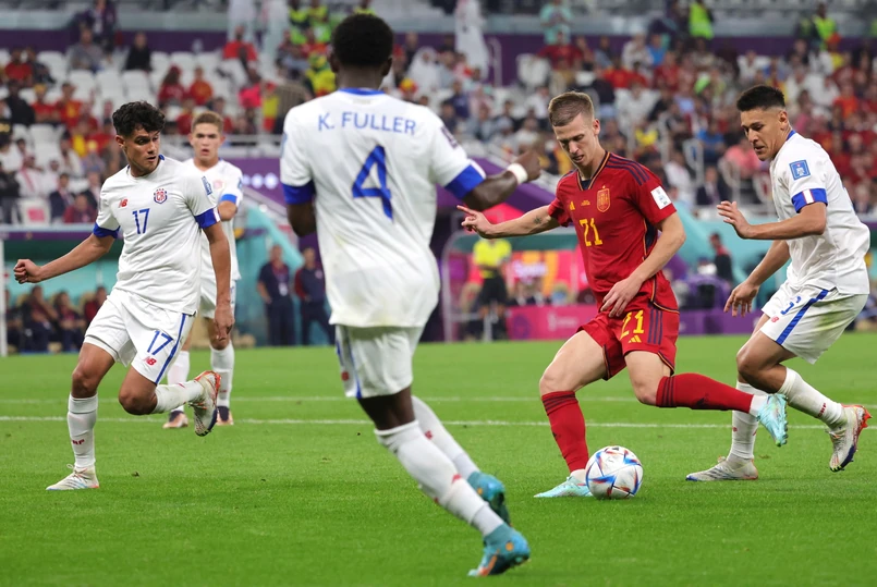 Kostaryka była "na kolanach" już po pierwszej połowie. Pierwszy do siatki trafił w 11. minucie Dani Olmo, który efektownie przyjął piłkę stojąc tyłem do bramki, odwrócił się i bez problemu pokonał doświadczonego bramkarza Keylora Navasa.