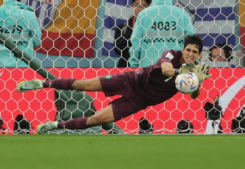 Na swój pierwszy celny strzał Hiszpanie czekali do 54. minuty, kiedy po rzucie wolnym zza bocznej linii pola karnego mocno uderzył Dani Olmo, ale Bounou bez kłopotu wypiąstkował piłkę. W końcówce drugiej połowy marokański bramkarz raz jeszcze pokazał się z dobrej strony, kiedy ponownie Olmo z rzutu wolnego dośrodkował w pole karne i nikt nie dotknął piłki zmierzającej do bramki, ale Bounou zachował czujność i wybił ją na rzut rożny.
