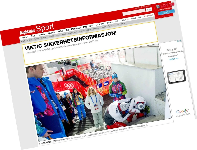 Stołeczny dziennik "Dagbladet" prezentuje fotografię Kamila już po konkursie i z bukietem kwiatów w ręku, skurczonego w spazmie bólu. Pomaga mu się podnieść jeden z polskich trenerów. Do bólów żołądka trapiących go wczorajszego dnia Polak przyznał się też dziennikarzom podczas konferencji prasowej. Gazeta tytułuje informację na ten temat "Dramat za kulisami".