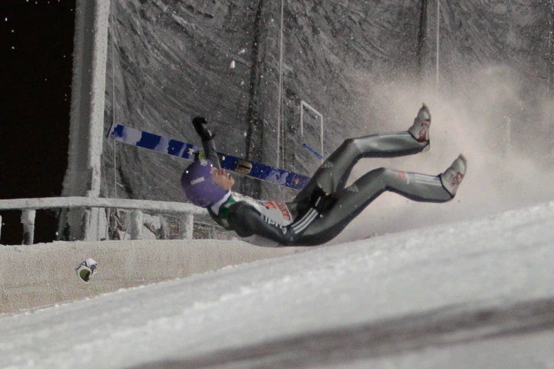 1 Niemiec dostał silny boczny podmuch wiatru i stracił równowagę. Skoczek spadł ze sporej wysokości na zeskok.