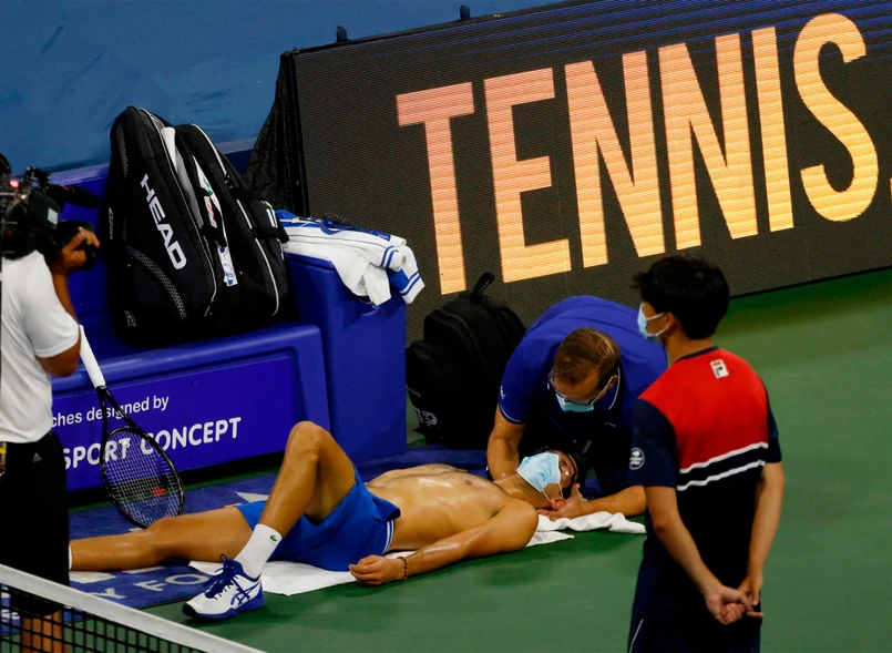 Podczas przerwy medycznej - w związku z pandemią koronawirusa - zarówno on, jak i turniejowy fizjoterapeuta mieli założone maseczki i ochronne okulary.